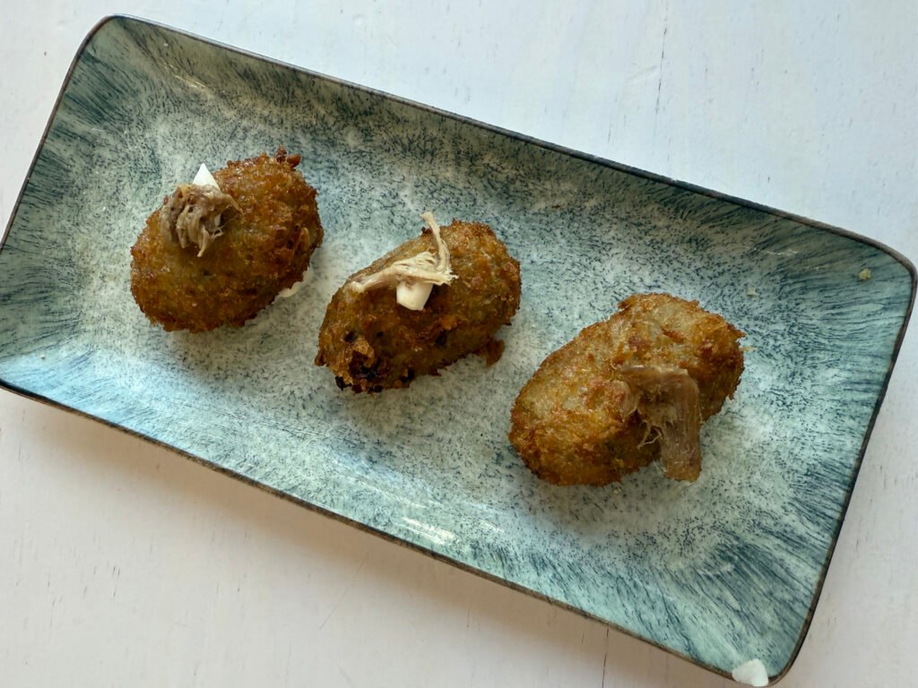 Pan bao meloso de papada ibérica caramelizada en salsa oriental con pepino encurtido y hierbas aromáticas
